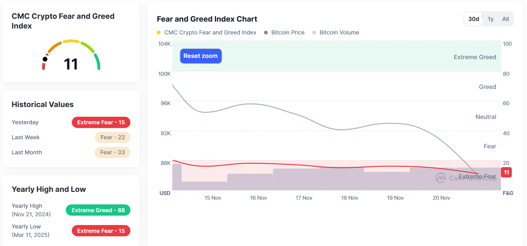 As of November 21, the "Fear and Greed Index" was approximately 11 points, placing it in the "extreme fear" range.