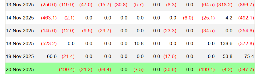 This week, ETFs exhibited a structural weakness characterized by "large-scale outflows → brief inflows → further outflows." On Thursday, November 13th, Bitcoin ETFs saw a net outflow of $866.7 million, the largest single-day outflow so far this month. From November 14th to 18th, outflows narrowed compared to the 13th, but the trend of capital withdrawal continued. A small inflow of $75.4 million occurred on the 19th, led by BlackRock's IBIT, bringing in $60.6 million. However, this rebound was insufficient to offset the over $500 million loss incurred the previous day. On the 20th, another significant outflow of $547.7 million occurred.