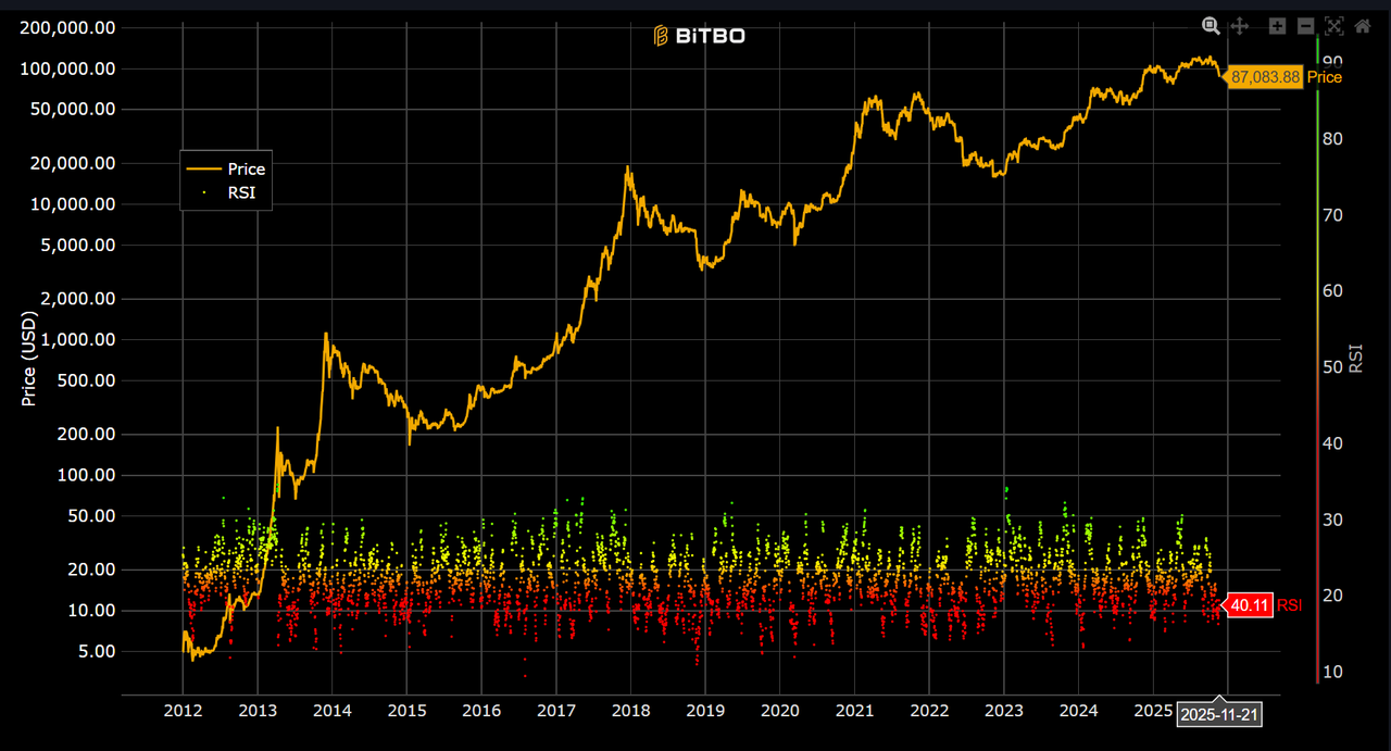 As of the end of this period, Bitcoin's 14-day RSI was 40.11, not reaching oversold levels (RSI < 30), showing a slight recovery from the previous few days, but still within a clearly weak range. The RSI remaining in the 30–45 range indicates that the market remains weak; short-term oversold pressure has eased somewhat, but the rebound momentum is currently insufficient.