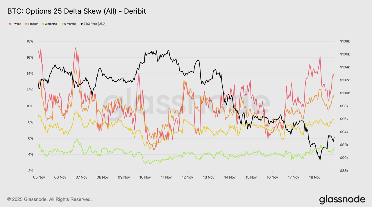 After Bitcoin briefly dipped below $90,000, the options market immediately repriced risk, with implied volatility across all maturities rising significantly, particularly at the short end. This reflects two main drivers: first, a surge in demand for downside protection; and second, a large number of short-term gamma positions were forced to be covered and rolled upwards, passively pushing up short-term volatility. Current implied volatility levels are approaching the highs seen during the October 10th liquidation event, indicating that traders are rapidly increasing their assessment of short-term risk. The 25-delta skew remains negative across all maturities, with the one-week term approaching extreme bearish levels. The premium for one-week put options is approximately 14%, suggesting a willingness to significantly increase downside protection costs. This type of buying leads market makers to short delta, further selling futures or perpetual contracts for hedging, potentially creating a self-reinforcing downward pressure. While the medium- to long-term skew is also bearish, it is less pronounced than at the short end, with the six-month term slightly below 5%, indicating that pressure is primarily concentrated in the short term.