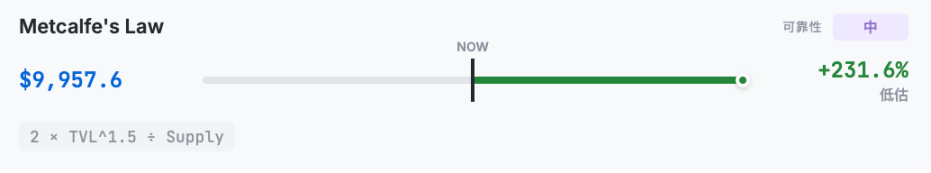 Hashed stated that the model has been empirically validated by academic researchers (Alabi 2017, Peterson 2018) on Bitcoin and Ethereum. TVL is used as a proxy metric for network activity. The calculation formula is 2 × (TVL/1B)^1.5 × 1B ÷ Supply, yielding a price of $9957.6, representing a 231.6% upside from the current price.