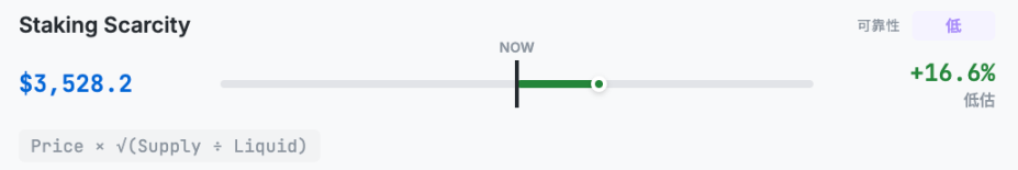 The model takes into account that Ethereum that cannot circulate in the market due to staking will increase Ethereum's "scarcity". Multiplying the current price of Ethereum by the square root of the ratio of total supply to circulating supply, i.e., Price × √(Supply ÷ Liquid), the resulting price is 3528.2, which is 16.6% upside from the current price.