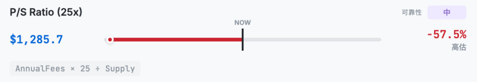In Ethereum, the price-to-sales ratio (P/S ratio) refers to the ratio of market capitalization to annual transaction fee revenue. Since transaction fees ultimately go to validators, there is no price-to-earnings ratio (P/E ratio) for the network. Token Terminal uses this method for valuation, with 25 times earnings representing a growth-oriented tech stock valuation level, which Hashed calls the "industry standard for L1 protocol valuation." The model's calculation formula is Annual_Fees × 25 ÷ Supply, resulting in a price of $1285.7, representing a 57.5% downside from the current price.