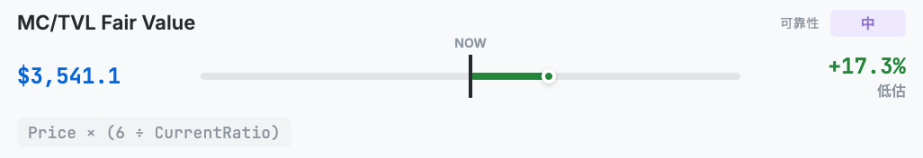 This model is essentially a mean reversion model. The calculation method assumes that the historical average value of the market capitalization to TVL ratio is 6 times. If it exceeds 6 times, it is considered overvalued, and if it is not 6 times, it is considered undervalued. The formula is Price × (6 ÷ Current Ratio), which gives a price of $3,541.1, representing a 17.3% upside potential from the current price.