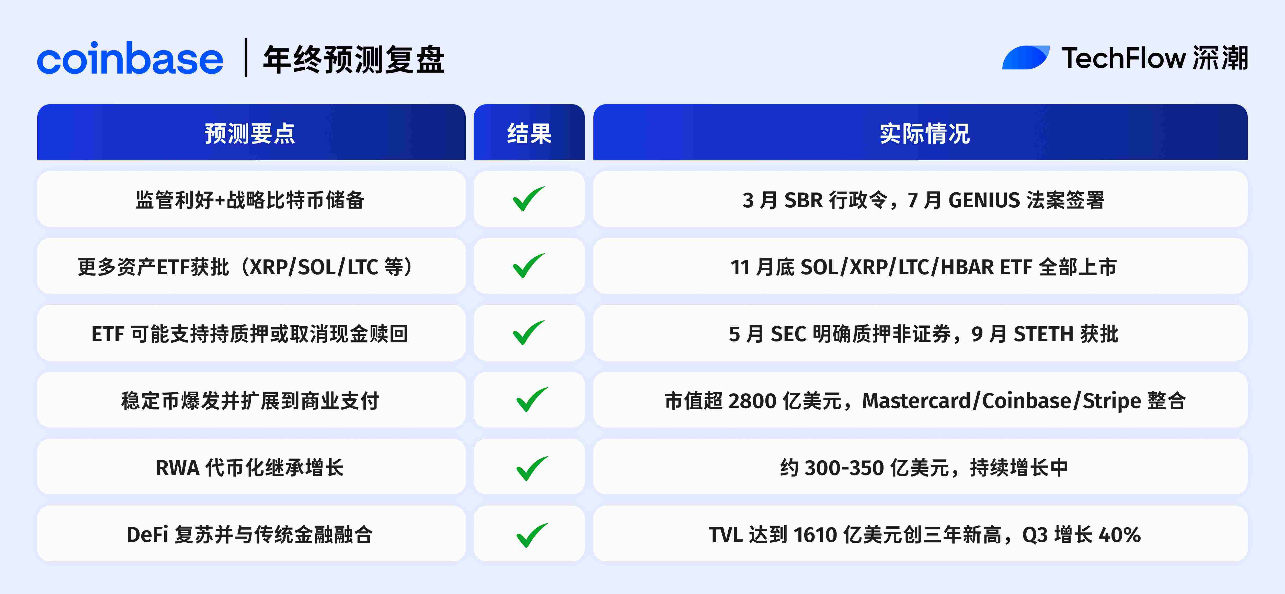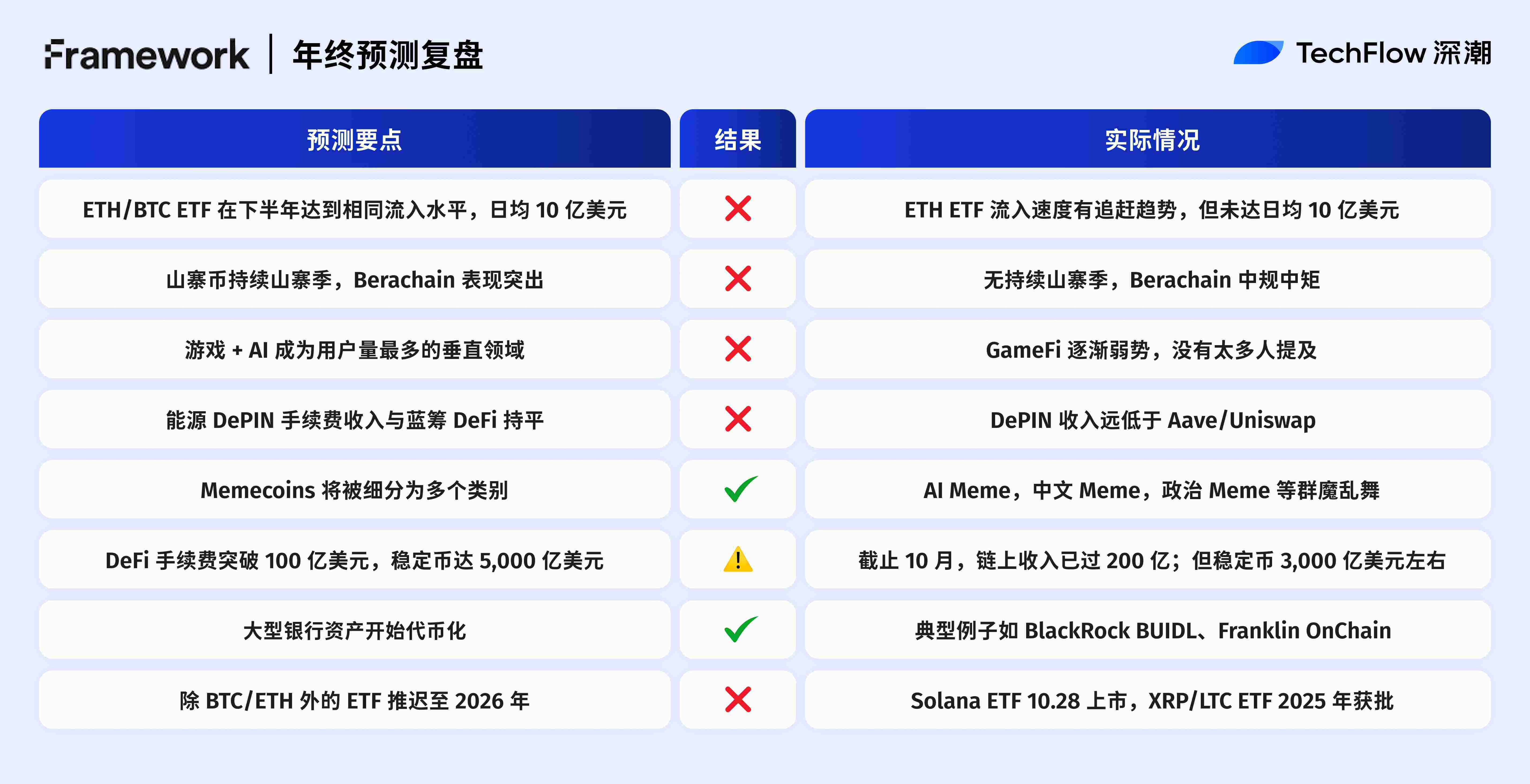 - Price targets all failed to materialize: projected prices for BTC, ETH, and SOL were far higher than their actual performance this year. Coinbase's stock price at $250 is 65% below its $700 target. The estimated $50 billion tokenization of RWA is also clearly an overestimation.