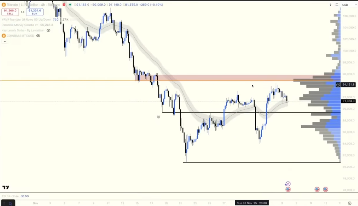 Miles: There is still a significant resistance area above the market. If we look at the daily chart, we can see that the price is trying to break through the moving average above. On the 4-hour chart, the Point of Control (POC) of the Visible Volume Range (VRVP) is still around 96,000, which forms a clear resistance area.