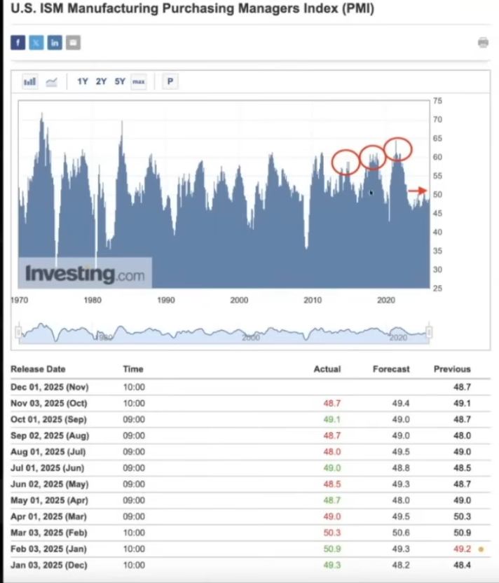 Miles: If we want to determine whether the market will be bullish in 2026, we must analyze it from a macroeconomic perspective. Let's start by talking about the ISM Manufacturing Index (this indicator is actually a key economic indicator used to track business cycles) . Currently, the ISM index is much lower than in previous cycles, and Bitcoin usually shows an upward trend before the ISM. Nevertheless, the ISM is expected to rebound in the future. If we look back at the past three cycles, Bitcoin only peaked when the ISM exceeded 55; in other words, the current Bitcoin rally has not truly begun.