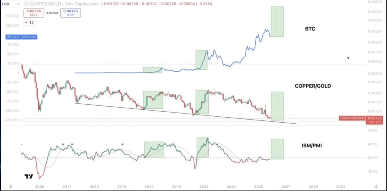 To determine whether 2026 will ultimately be bullish, we need to look at the macro picture, which is also your strength. First, I want to discuss the ISM. I know Raoul Pal talks about this frequently; the ISM index is actually much lower than in previous cycles, and Bitcoin typically leads the ISM, so it's performing well. But we expect to see a rebound. If you look at the past three cycles, Bitcoin only peaked when the ISM was above 55. It hasn't really started its big rally yet.