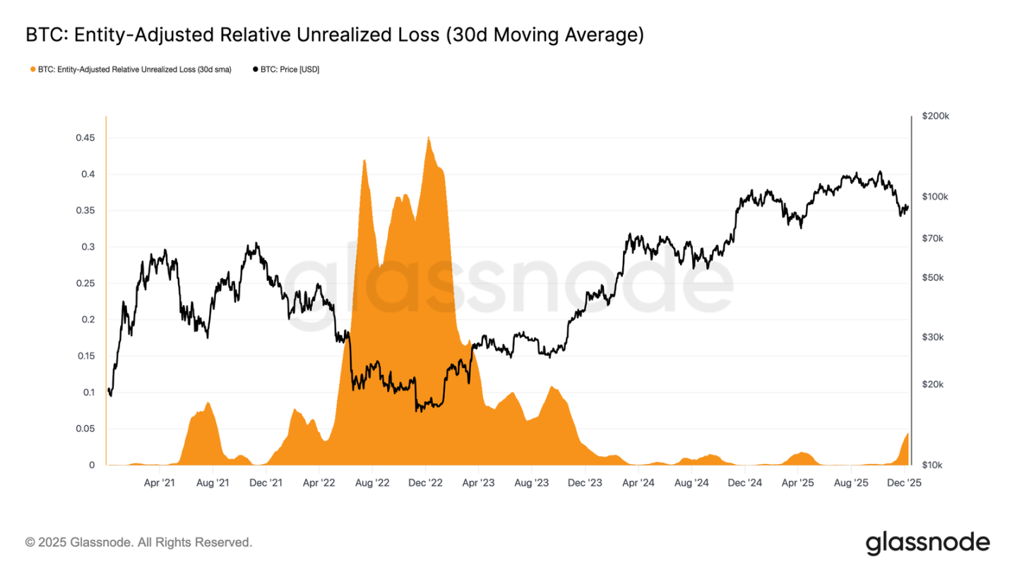 The relative unrealized loss (30-day simple moving average) has climbed to 4.4%, after nearly two years remaining below 2%, marking a shift from a frenzied phase to one of increased stress and uncertainty. This indecisiveness currently defines the price range, and resolving this issue requires a new wave of liquidity and demand to rebuild confidence.