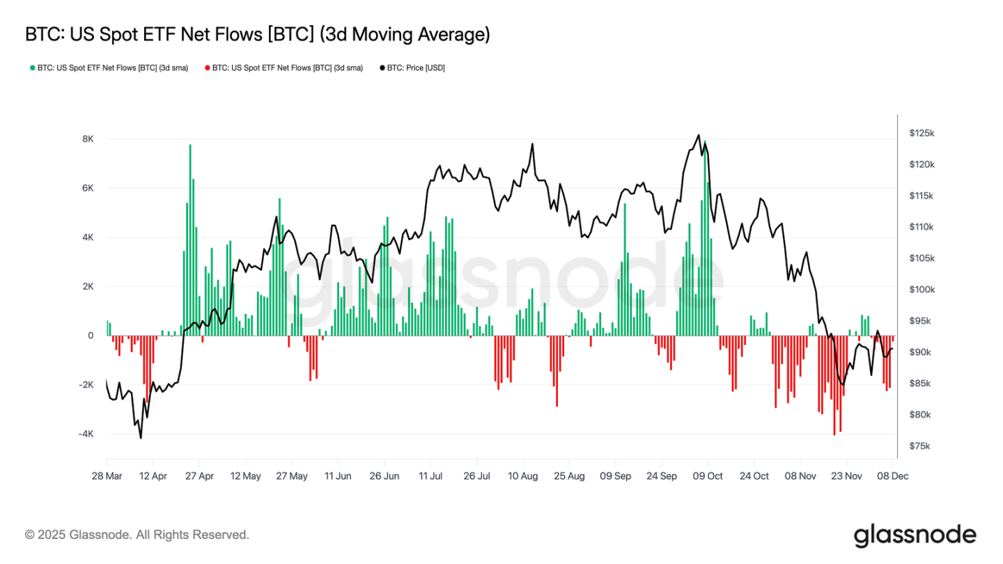 Turning to the spot market, US Bitcoin ETFs experienced another quiet week, with the three-day average net inflow remaining negative. This continues the cooling trend that began in late November, marking a significant departure from the strong inflow mechanism that supported the price rally earlier this year. Redemptions from several major issuers remained stable, highlighting a more risk-averse stance from institutional allocators amid broader market instability.