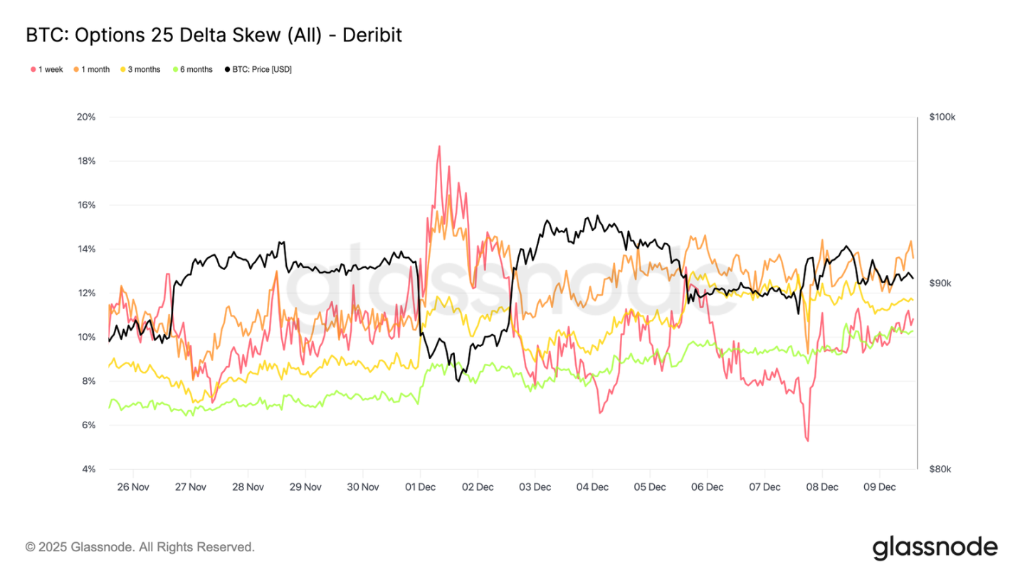 Skewness remains tightly clustered across all maturities, ranging from 10.3% to 13.6%. This compression suggests that the preference for put protection is across the entire curve, reflecting a consistent risk aversion rather than isolated pressures limited to the short end.