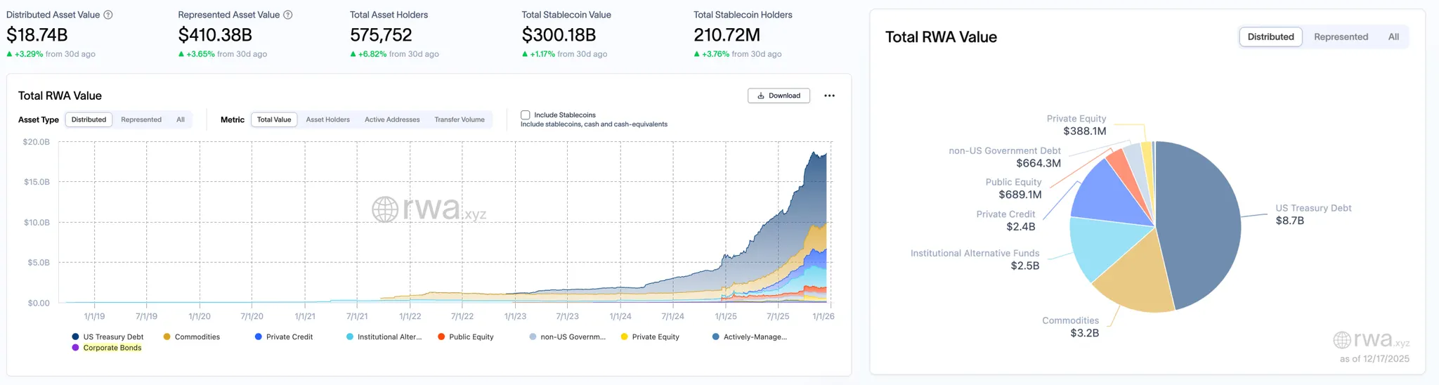 According to the rwa.xyz data dashboard, as of December 17, 2025, the total on-chain asset value (Distributed Asset Value) of RWA was $18.74 billion , an increase of $300 million from $18.44 billion on December 9, representing a growth of approximately 1.63% . This ended a period of sideways trading and indicates that the activity of on-chain assets is gradually recovering. The represented asset value increased from $391.66 billion to $410.38 billion , a weekly increase of 4.92% , the largest weekly increase in nearly two months, which may be related to the recovery in the valuation of off-chain assets. The total number of asset holders also continued to rise, from 561,558 to 575,752 , a net increase of over 14,000 in one week, representing a growth of 2.52% . The stablecoin market was relatively stable, with the total market capitalization decreasing slightly from $301.92 billion to $300.18 billion , but still remaining at a high level. The number of users increased from 207.75 million to 210.72 million , an increase of nearly 3 million, or 1.42%.