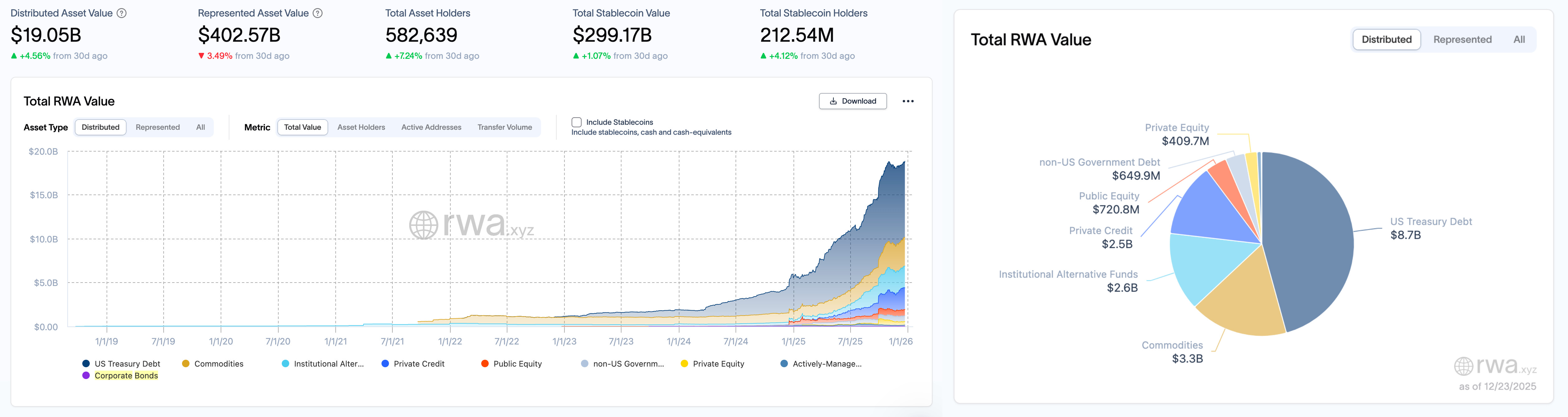 According to data from rwa.xyz, as of December 23, 2025, the total on-chain value (Distributed Asset Value) of RWA continued its moderate growth this week, increasing from $18.74 billion on December 17 to $19.05 billion, an increase of approximately $310 million, representing a weekly increase of 1.65%. The broader RWA market size, however, contracted slightly, falling from $410.38 billion to $402.57 billion, a decrease of $7.81 billion, or 1.9%. The total number of asset holders increased from 575,752 to 582,639, a weekly increase of 6,887, or 1.2%. Meanwhile, the stablecoin user base continued to grow, with the number of holders climbing from 210.72 million to 212.54 million, an increase of approximately 1.82 million, or 0.86%. The total market capitalization of stablecoins has declined slightly, from $300.18 billion to $299.17 billion. Although the decline is slight, the magnitude is very small (about $101 million), and the overall market remains relatively stable.