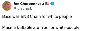 A while ago, I couldn't help but laugh when I came across Jon Charbonneau's tweet. When Base is called "the white man's BNB chain," what exactly is being said behind this joke?