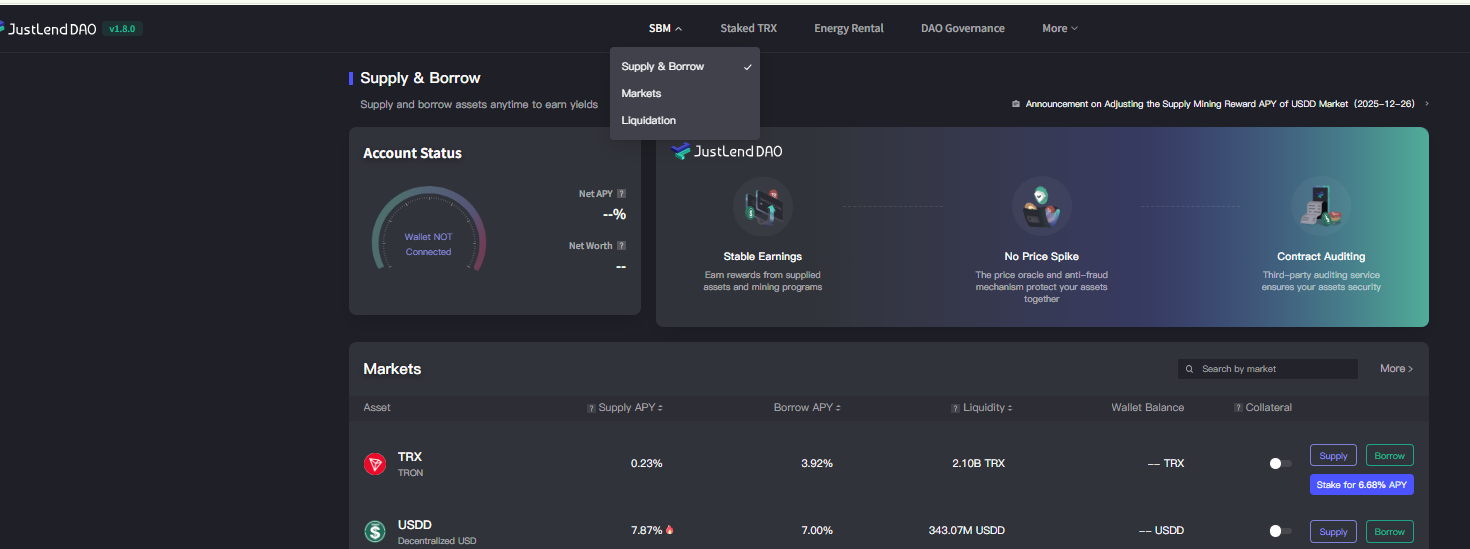 Currently, JustLend DAO has completed deep integration of multiple core DeFi modules, forming an integrated product matrix covering the lending market (SBM), liquid staking sTRX (Staked TRX), and Energy Rental, providing users with comprehensive and diverse on-chain financial services.