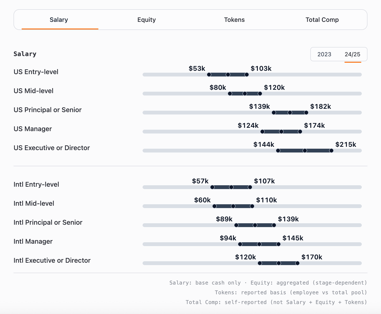 Overall, salaries and token grants have declined for almost all levels. US roles still lead in cash compensation, while international teams narrow the gap through higher equity and token allocations.