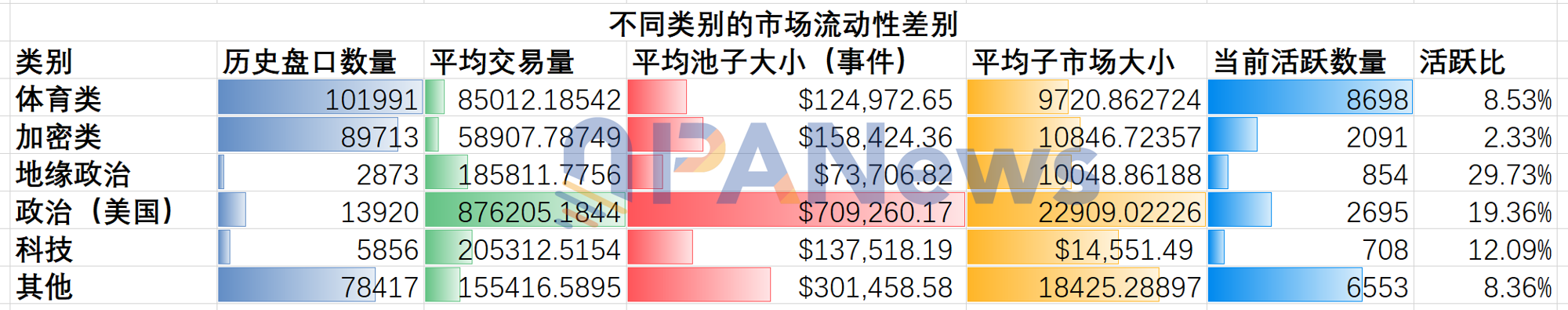 经过上述的分析,我们能够对预测市场不同的分类作出新的归类,即像加密货币、体育这类超短线的市场可称为短线型的市场,而政治、地缘政治、科技等分类则更偏向于长期沉淀的市场。