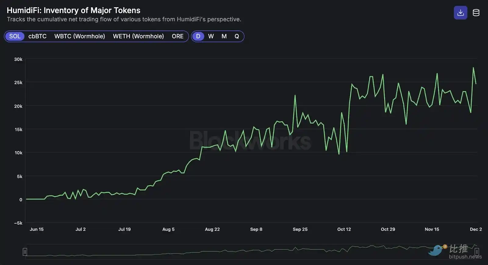 While HumidiFi's revenue is not public, we can estimate it by observing the change in its token inventory since inception. The core idea is that since HumidiFi essentially acts as a market-making desk (there's only one LP in an Active Market Making AMM), every trade with it has a winner and a loser. Over time, the net inventory change for the market maker reflects trading P&L. Therefore, we can track the cumulative net trading flow of various tokens from HumidiFi's perspective as a proxy for its revenue.
