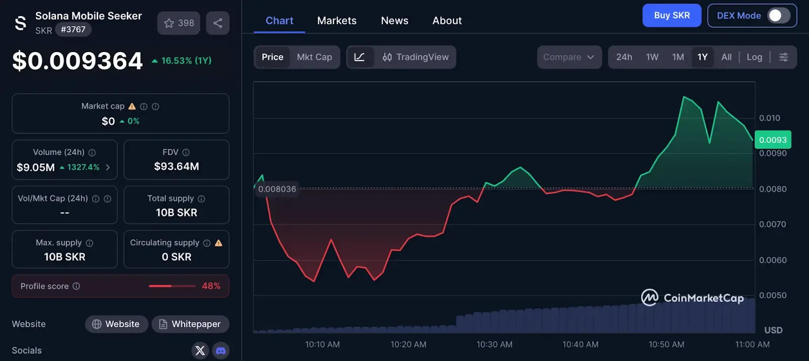 Data shows that SKR's price fluctuated between $0.006 and $0.01 in the first hour after launch. Based on the current market price at the time of writing, approximately $0.0095, the airdrop value for the lowest-tier Scout holders is $47.5; while the highest-tier Sovereign holders receive up to $7,125. Compared to the Seeker phone's pre-sale cost of around $450 to $500, this represents a maximum return of over 14x.