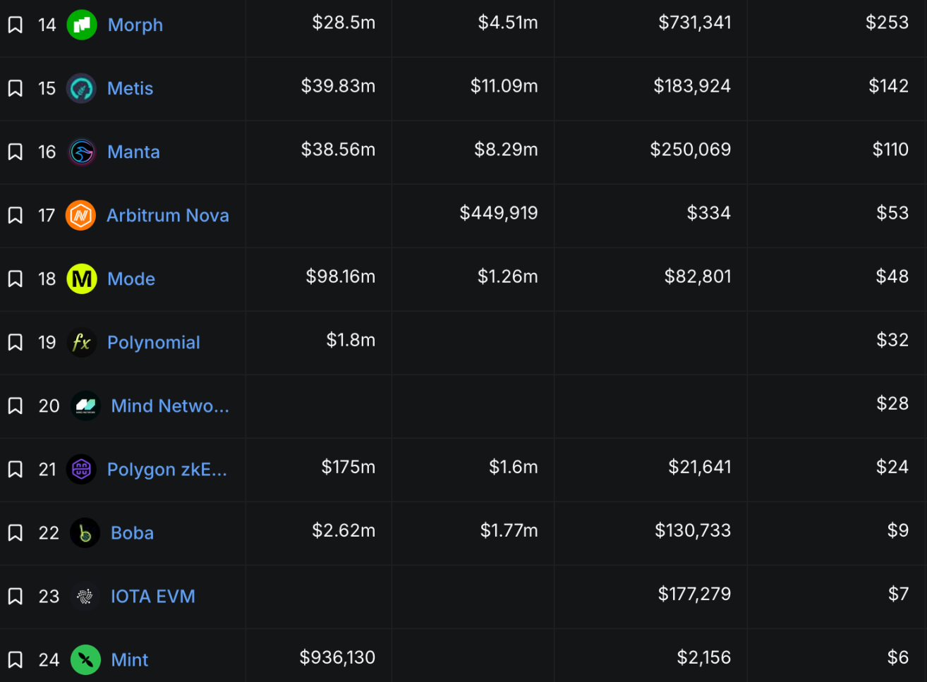 - Protocol Revenue is Bleak: In the past 24 hours, only the top 7 L2 protocols had revenues exceeding $1000. Most revenues are meager, making it difficult to sustain ecosystem development.