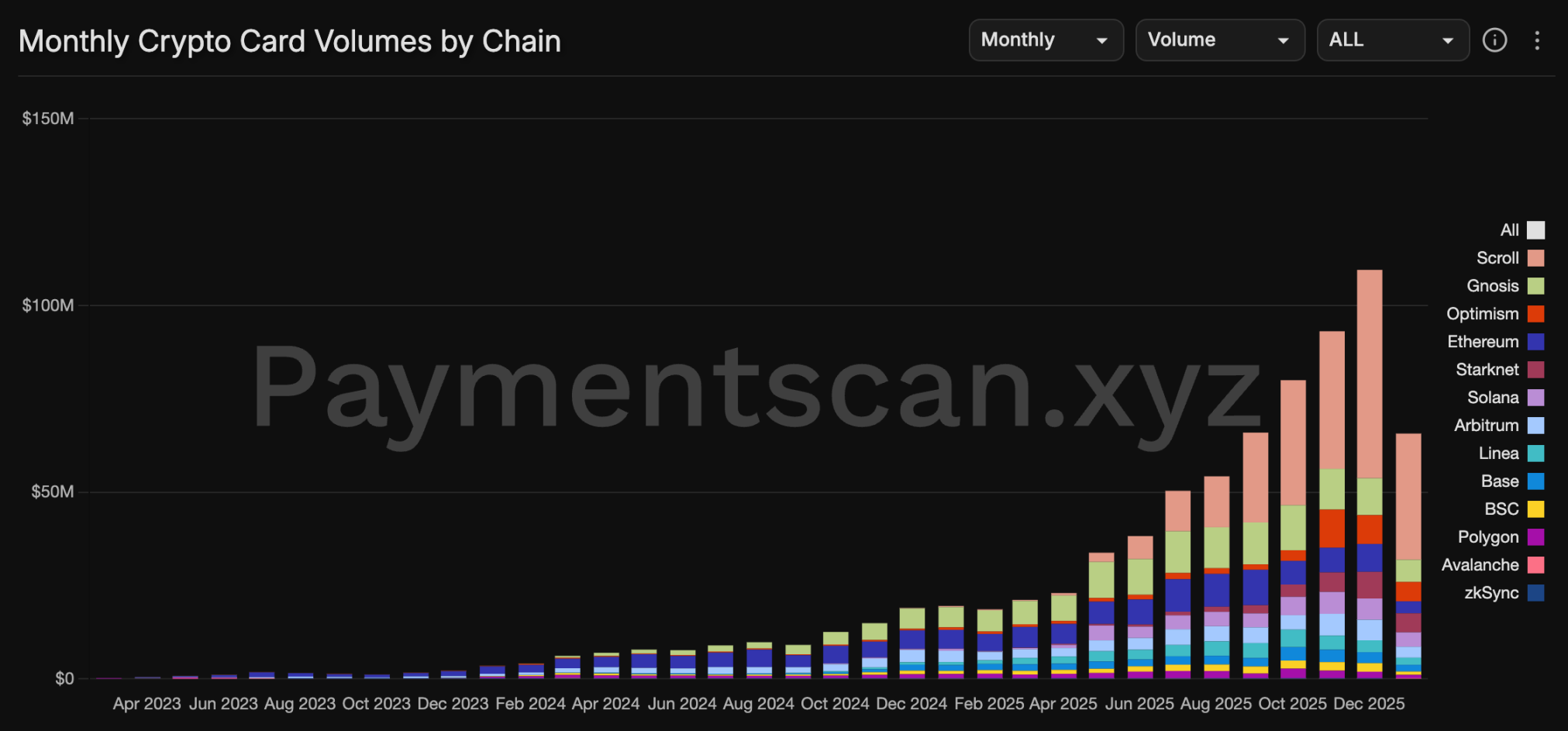 Due to the per-transaction settlement nature of non-custodial cards, each user purchase corresponds to a contract call to verify the remaining asset balance and an on-chain asset transfer. This way, L2s can rely on the absolutely high-frequency and sustainable scenario of payments to ensure a certain level of on-chain activity. According to Paymentscan data, Scroll, through its partnership with Etherfi and SCR subsidies, has captured a significant market share in card payments. However, this data isn't entirely accurate, as many card payments might not trigger on-chain transfers but are settled internally by institutions. Regardless, it's an undeniable fact that L2s have found a practical application scenario through payments.