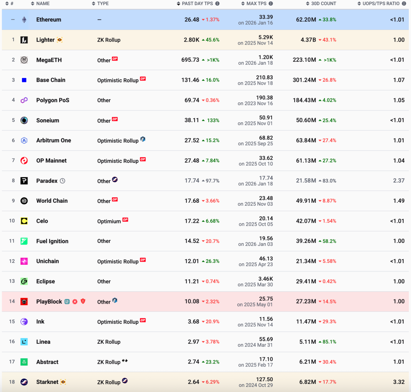 Data shows that among general-purpose L2s, apart from Base and Polygon, even Arbitrum and OP Mainnet's TPS are not significantly higher than Ethereum's. Linea and Starknet have a TPS of less than 3. The part not captured in the screenshot includes Scroll with a TPS slightly over 1, and ZKsync, Blast, etc., with less than 1.