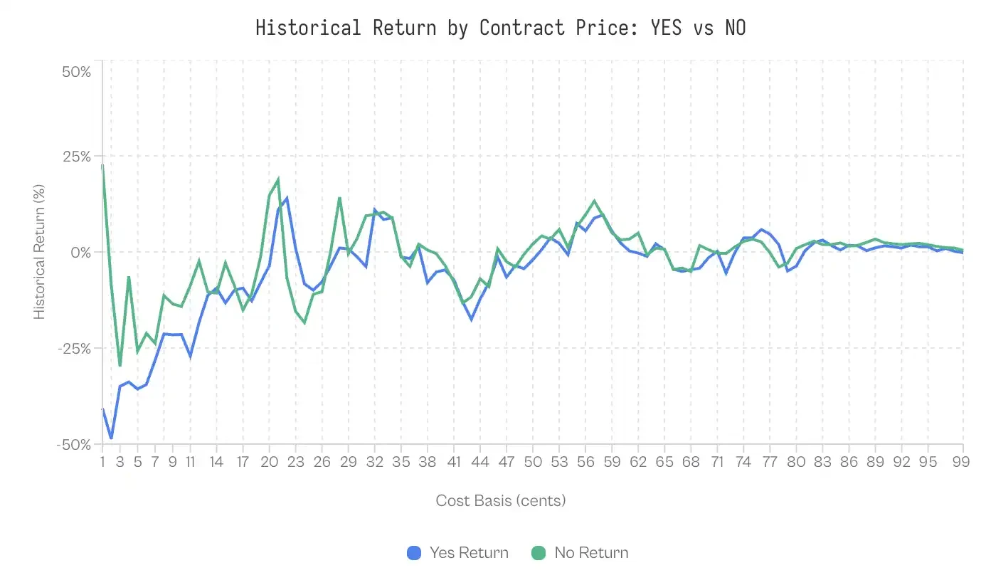 Yet data refutes this. At a 1-cent price, the historical expected return for "YES" is -41%; YES buyers expect to lose nearly half their capital. Conversely, a "NO" contract also priced at 1 cent has a historical expected return of +23%. The difference between these two seemingly identical probability estimates is a staggering 64 percentage points.
