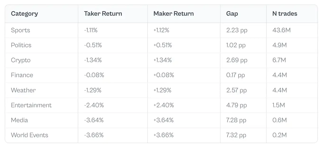 At the other end, World Events and Media show gaps exceeding 7 percentage points. Sports, the largest category by volume, exhibits a modest 2.23 percentage point gap. Given $6.1 billion in Taker volume, even this modest gap generates massive wealth transfer.