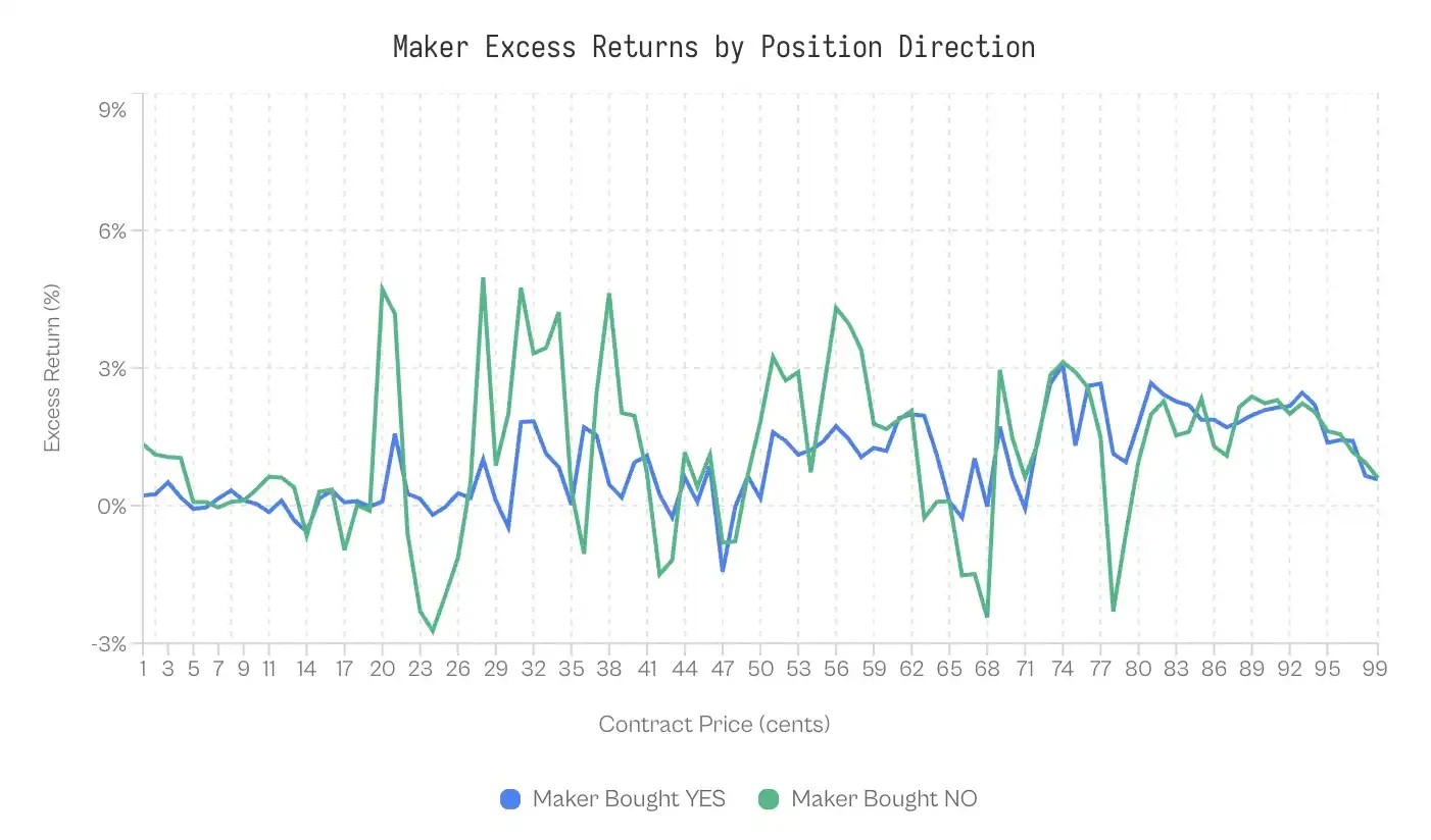 While plausible, two observations suggest otherwise. First, Maker returns depend on the direction they take. If profits were purely spread-based, it shouldn't matter whether a Maker buys YES or NO.