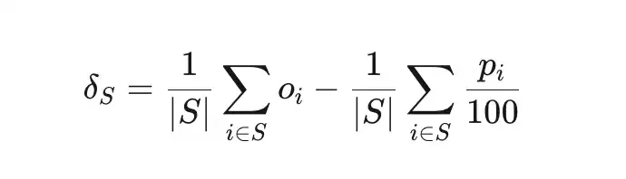 Mispricing (δS) measures the deviation between the actual win rate of a set of trades S and the implied probability.