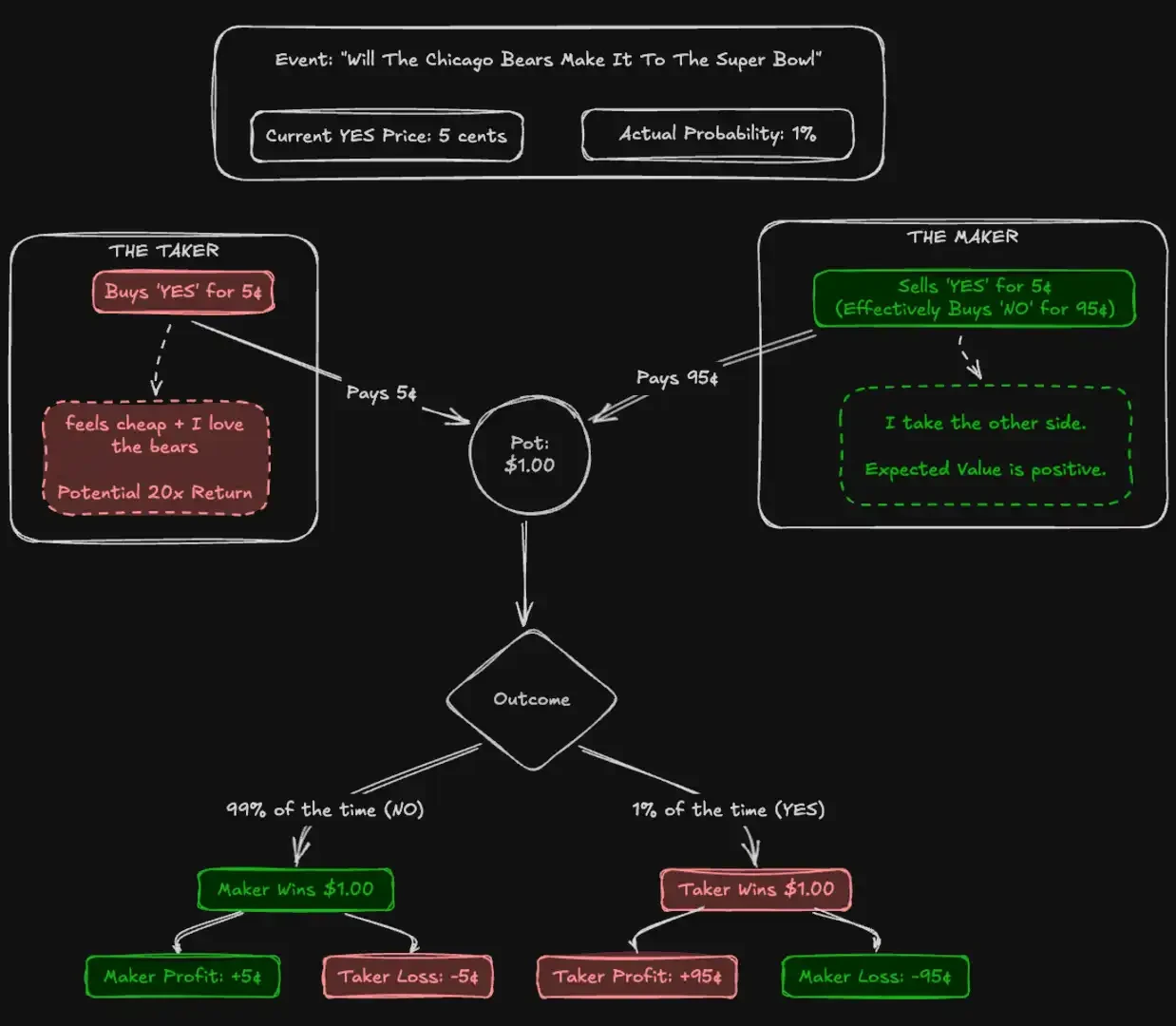 This statistical symmetry suggests market makers do not possess significant ability to predict winners. Instead, they profit through structural arbitrage: providing liquidity to a population of "Takers" who prefer high-risk, high-reward outcomes.