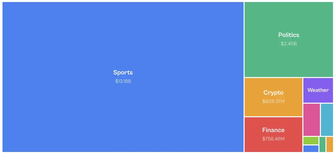 Launched in 2021, Kalshi is the first CFTC-regulated prediction market in the United States. The platform initially focused on economic and weather data, remaining niche until 2024. After a legal victory against the CFTC to list political contracts, the 2024 election cycle triggered explosive growth. Sports markets introduced in 2025 now dominate trading activity. Trading volume distribution across categories is highly uneven: Sports account for 72% of nominal volume, followed by Politics (13%) and Crypto (5%).