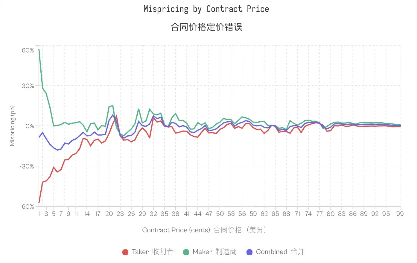 The market's overall mispricing is concentrated in specific populations: Takers bear the losses, Makers capture the gains.