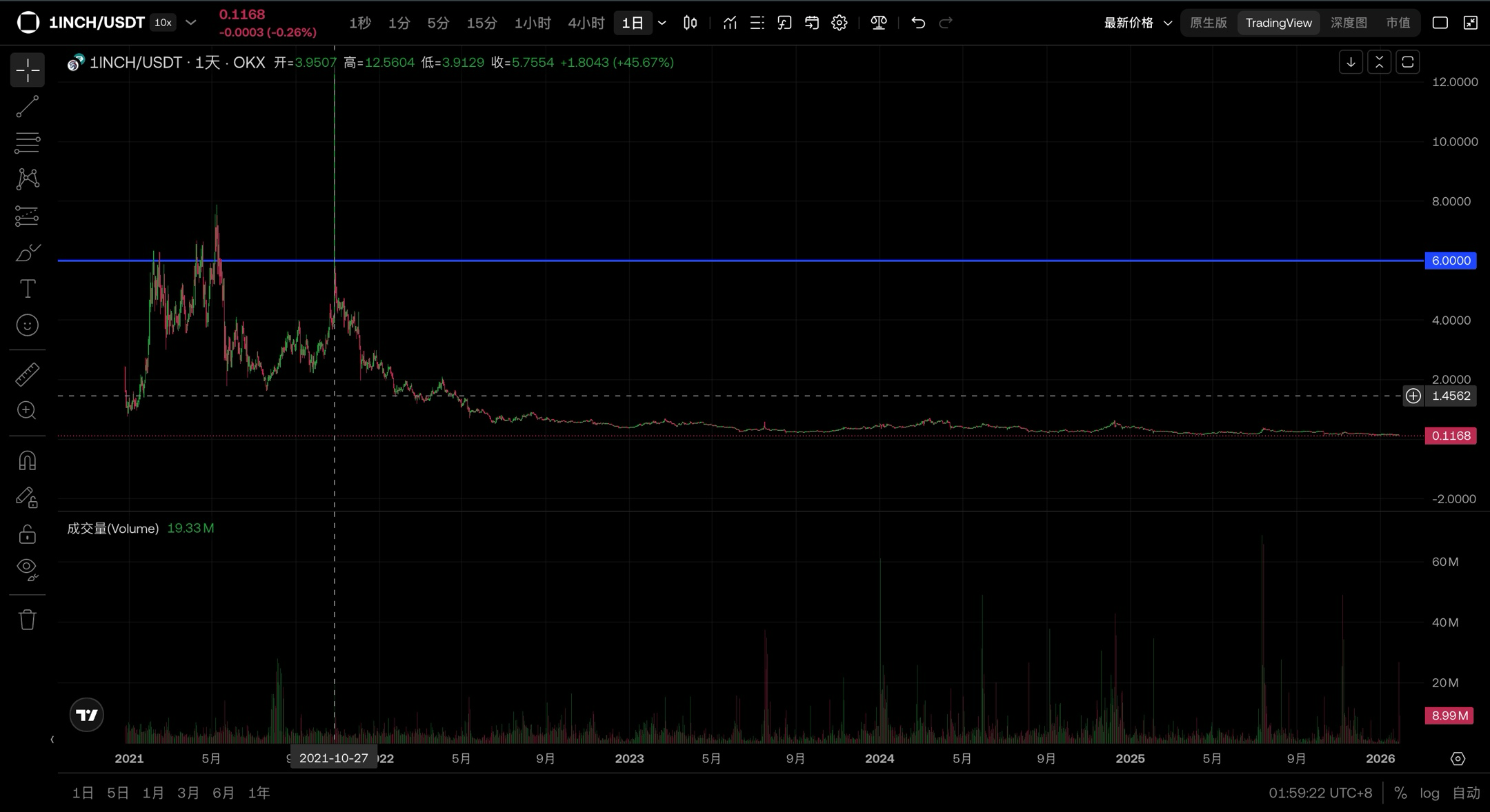 However, even if it is ultimately proven to be a misinterpretation, this sell-off still constituted a secondary impact on the already weakening price of 1INCH in practical terms. Since the previous cycle high of $6, 1INCH has experienced a prolonged unilateral decline and is now hovering around $0.11.