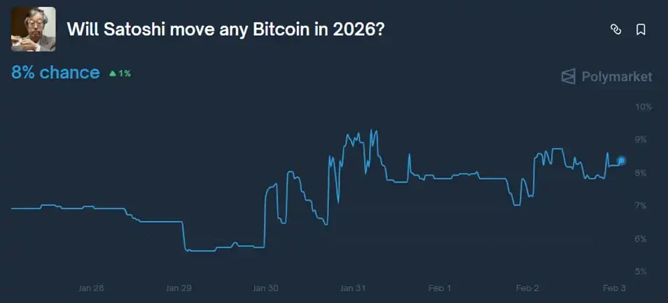 Following the release of this latest batch of Epstein documents, the probability of "Satoshi Nakamoto's Bitcoin addresses becoming active in 2026" on the prediction market Polymarket rose from about 6% to approximately 9.3% and currently stands at 8%.