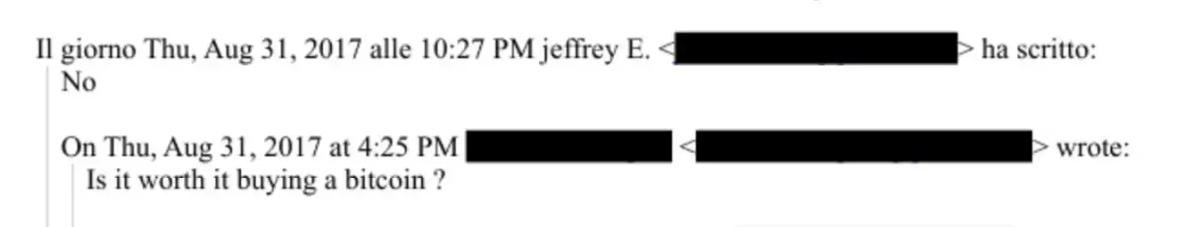 If Epstein did meet Satoshi Nakamoto, it seems Satoshi was unsuccessful in evangelizing Bitcoin to him during their contact. In an email exchange on August 31, 2017, when asked "Is it worth buying a Bitcoin?", Epstein bluntly replied, "No." At that time, one Bitcoin was worth less than $5,000.