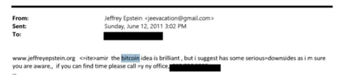 The email below is dated June 12, 2011, coinciding with Bitcoin's price peak that year. In the email, Epstein states, "Bitcoin is a brilliant idea, but it has some serious drawbacks."