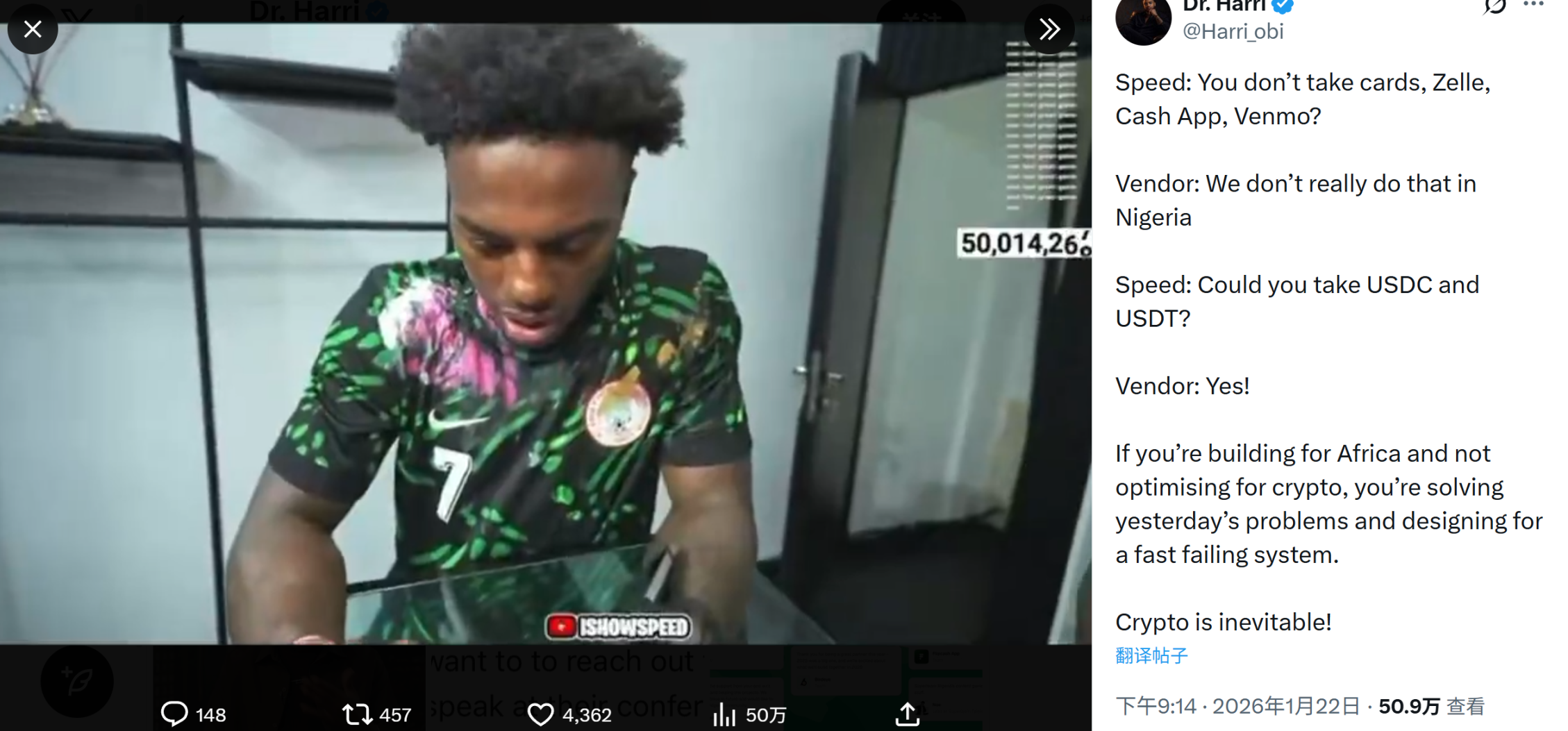 A recent typical case that broke into the mainstream: When globally renowned internet personality 'iShowSpeed' was shopping in Nigeria, traditional financial payment methods were frequently restricted (he mentioned issues with bank cards, Cash App, etc.). Ultimately, he chose to complete the payment using USDT/USDC, and the merchant was willing to accept it directly.