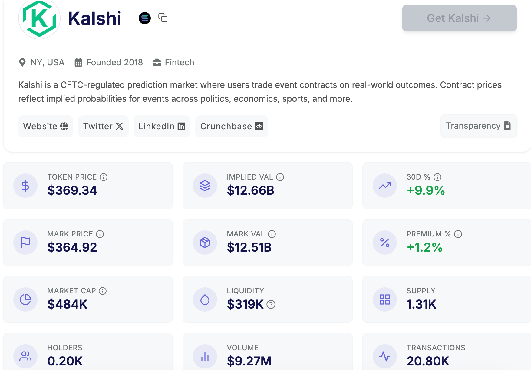 - PreStocks 上,Kalshi 隐含市值约为 140 亿美元,单股定价约为 407 美元;