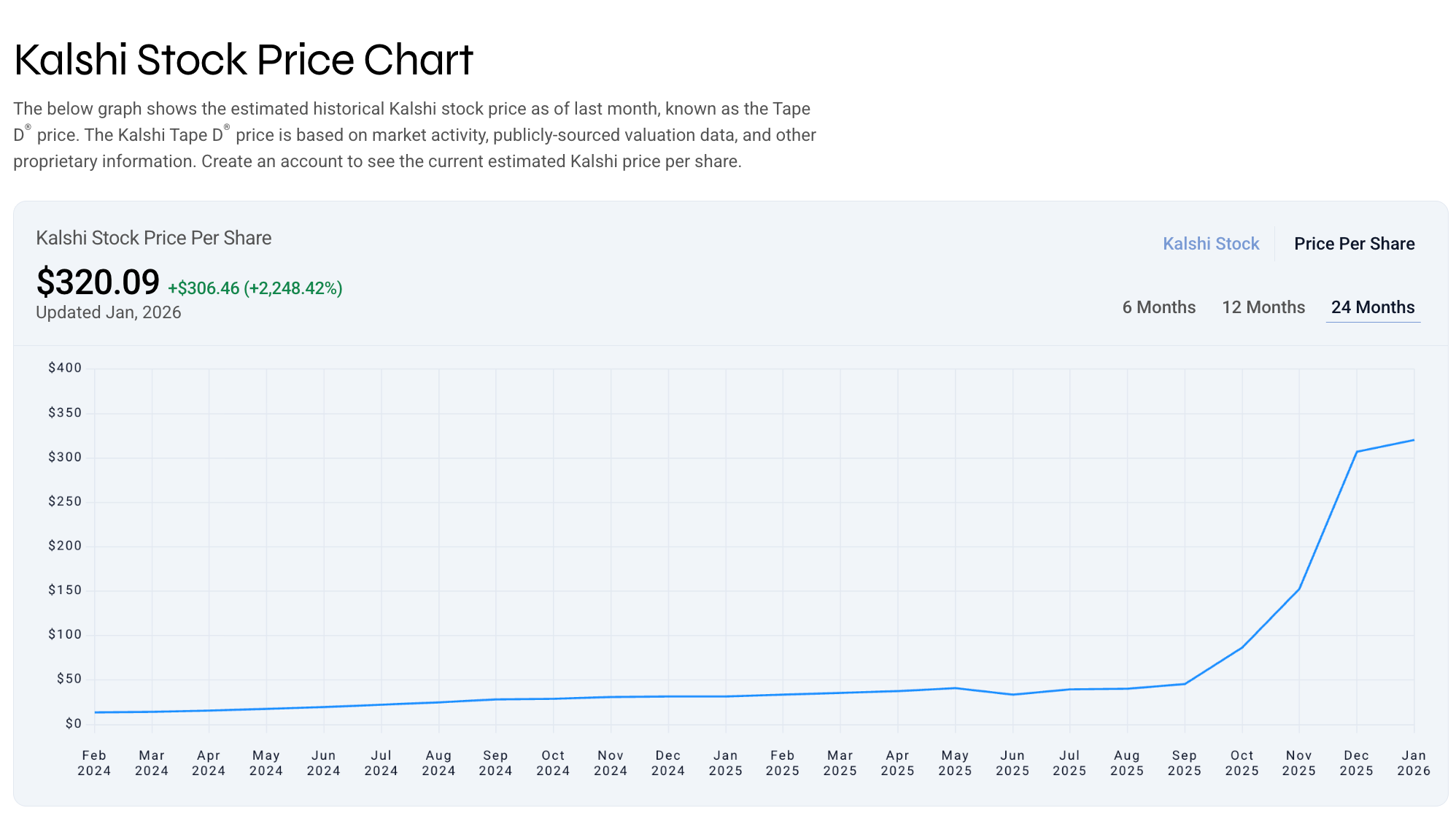 大盘下跌期,预测市场成了加密市场最亮眼的赛道。2 月初市场暴跌期间,BTC、ETH 一度跌幅超 10%,但预测市场交易依旧活跃,周交易笔数一度达 2639 万次,创历史新高。与此同时,作为美国最大的合规预测市场平台,Kalshi 在今年 1 月也以超 95 亿美元的交易量跃居赛道第一,创下单月成交量历史新高。随之而来的,则是市场对 Kalshi 盘前股价的新一轮定价。