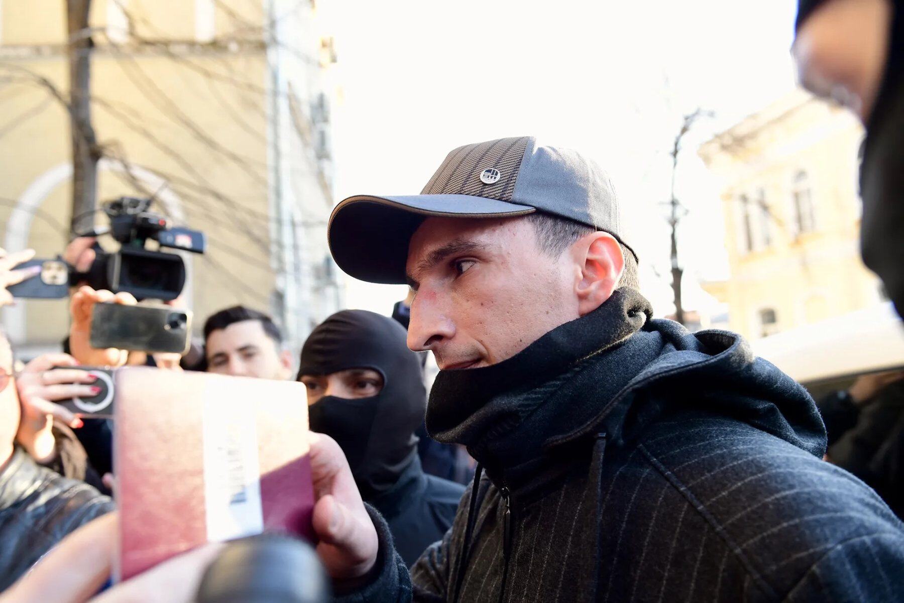 Bogdan Peșchir—known to his 200,000 TikTok followers as Bogpr—being escorted to the headquarters of the Bucharest General Prosecutor's Office. Photographer: Cristian Nistor / Romanian National News Agency Photo