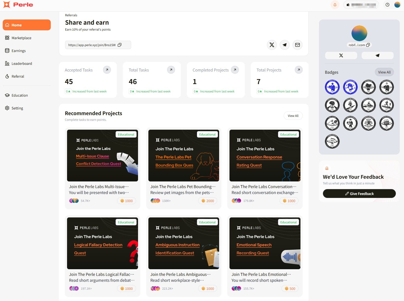 STEP 1. Go to the official website (Link: https://app.perle.xyz/) and click "Connect Wallet". Connect a wallet that supports the Solana network (there will be a personal referral link; inviting friends earns you 10% of the points they earn). Ensure your logged-in wallet has a small amount of SOL, as each task requires on-chain confirmation.