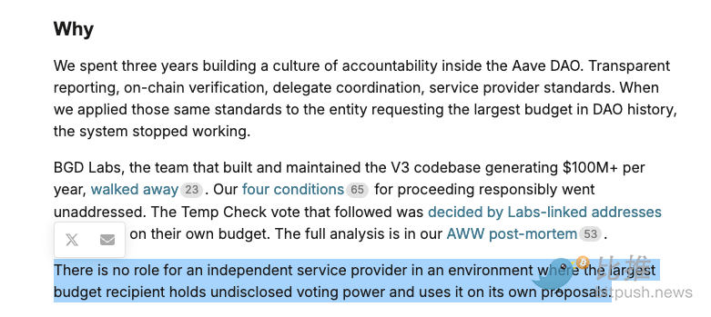 - Imbalance in core team roles and power: Aave Labs controls the brand and narrative, BGD maintains the revenue-generating V3, and ACI coordinates governance. This intended triangular structure of checks and balances has now collapsed.