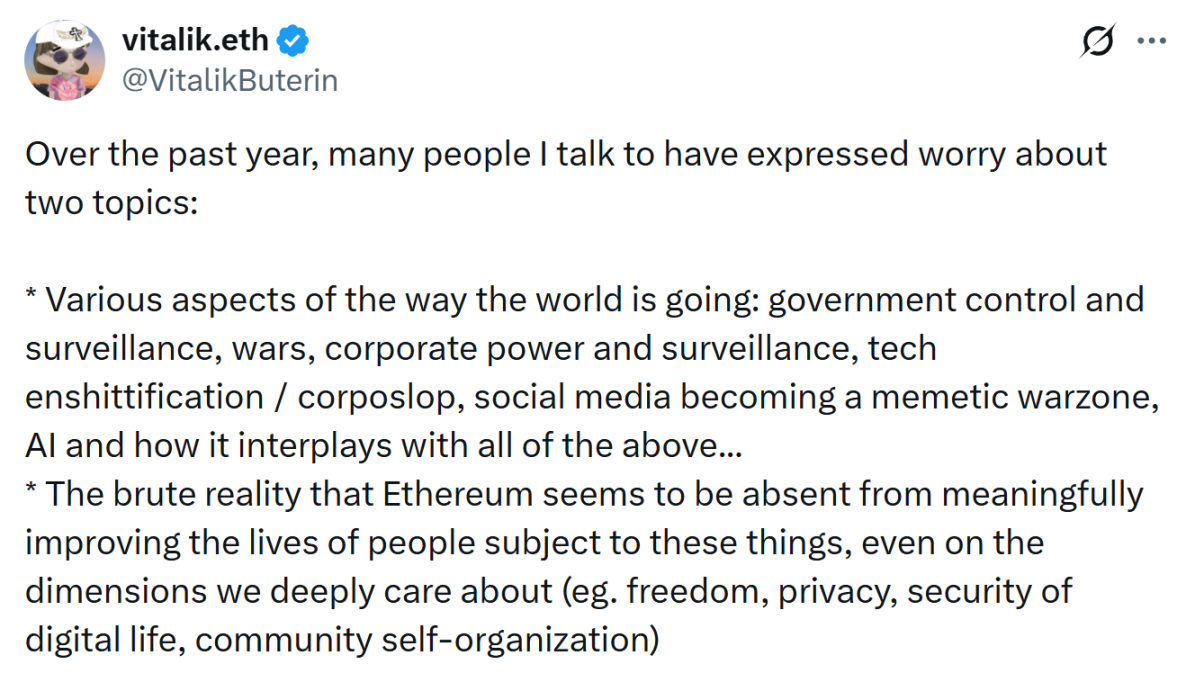 He did not continue using grand, "change the world" rhetoric. Instead, he acknowledged that to this day, Ethereum's improvement to the practical lives of ordinary people remains limited. For instance, while on-chain financial efficiency may have improved and the application ecosystem has become richer, many achievements still remain within the internal cycles of the crypto world.