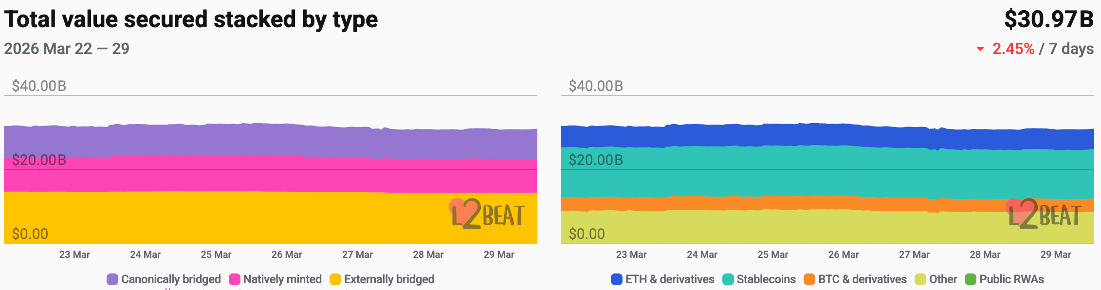According to L2Beat data, the total TVL of Ethereum Layer 2 this week is $30.97 billion, down 1.81% from last week's $31.54 billion.