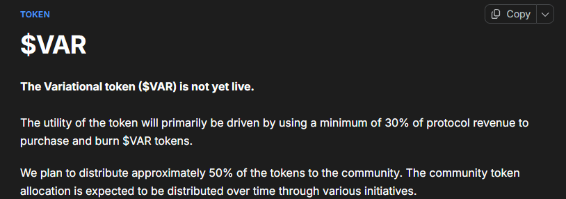 According to community feedback, while Variational has not provided an official TGE date, the community and Polymarket generally expect it to occur in Q3 to Q4 this year (as the official documentation states the loyalty program will end no later than September 30). Furthermore, based on the documentation, the project has committed to allocating approximately 50% of the token supply to the community (through various mechanisms like points and revenue sharing, not just a single airdrop). It also plans to use at least 30% of protocol revenue for VAR token buybacks and burns, with relatively clear governance and value capture mechanisms.