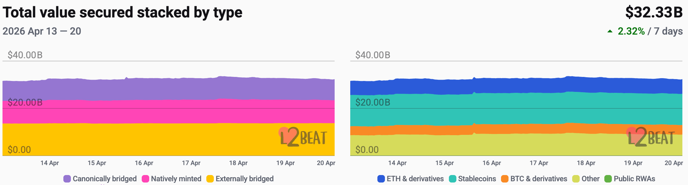 According to L2Beat data, the total Ethereum Layer 2 TVL this week is $32.33 billion, up 2.34% from $31.59 billion last week.