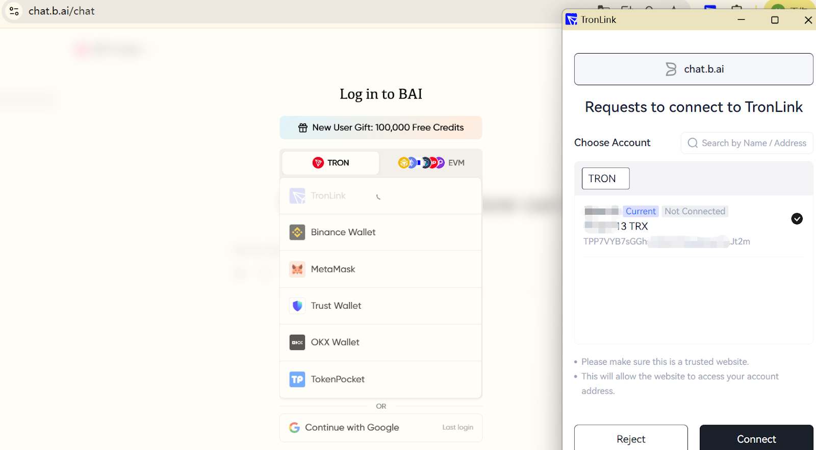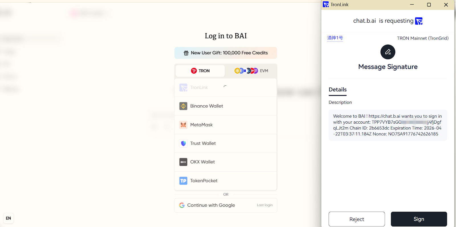 - Connect Wallet and Authorize Login: Visit the B.AI LLM Service page, click the "TronLink" icon. The system will automatically prompt the wallet plugin. Click "Sign" to authorize and log in.