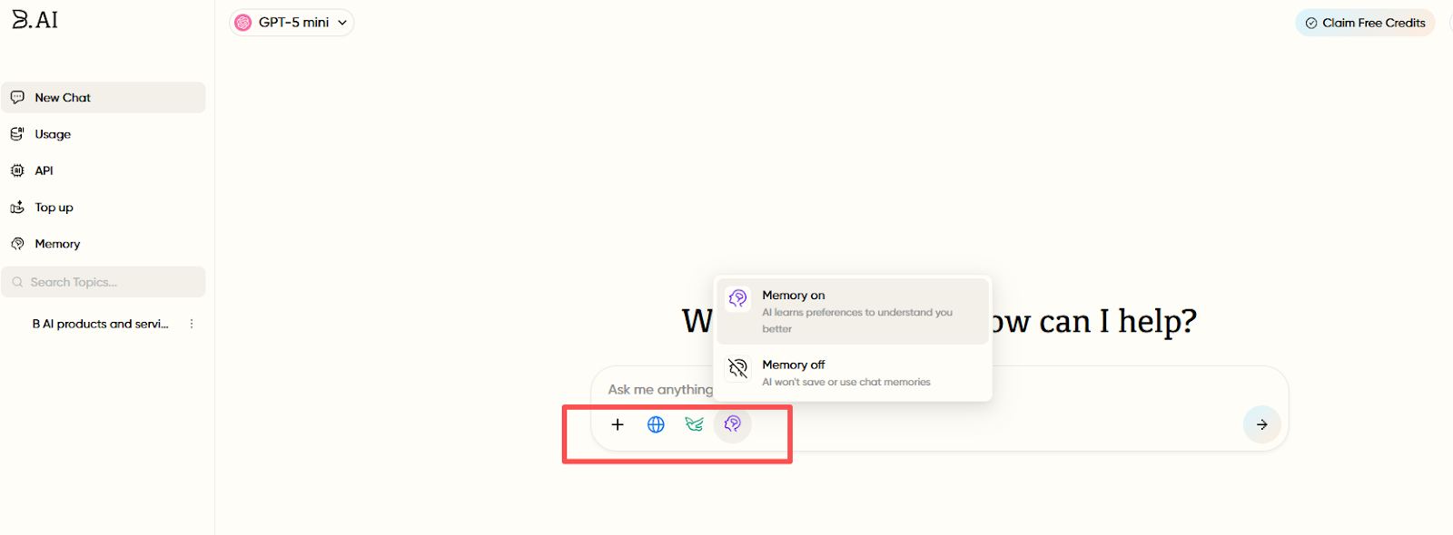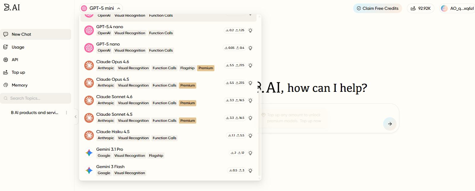 B.AI LLM Service operates on a pay-as-you-go credit system. Users consume credits for AI conversations and API services and can top up as needed. When the free credits run out, simply click "Top-up" in the left menu bar to replenish them quickly.