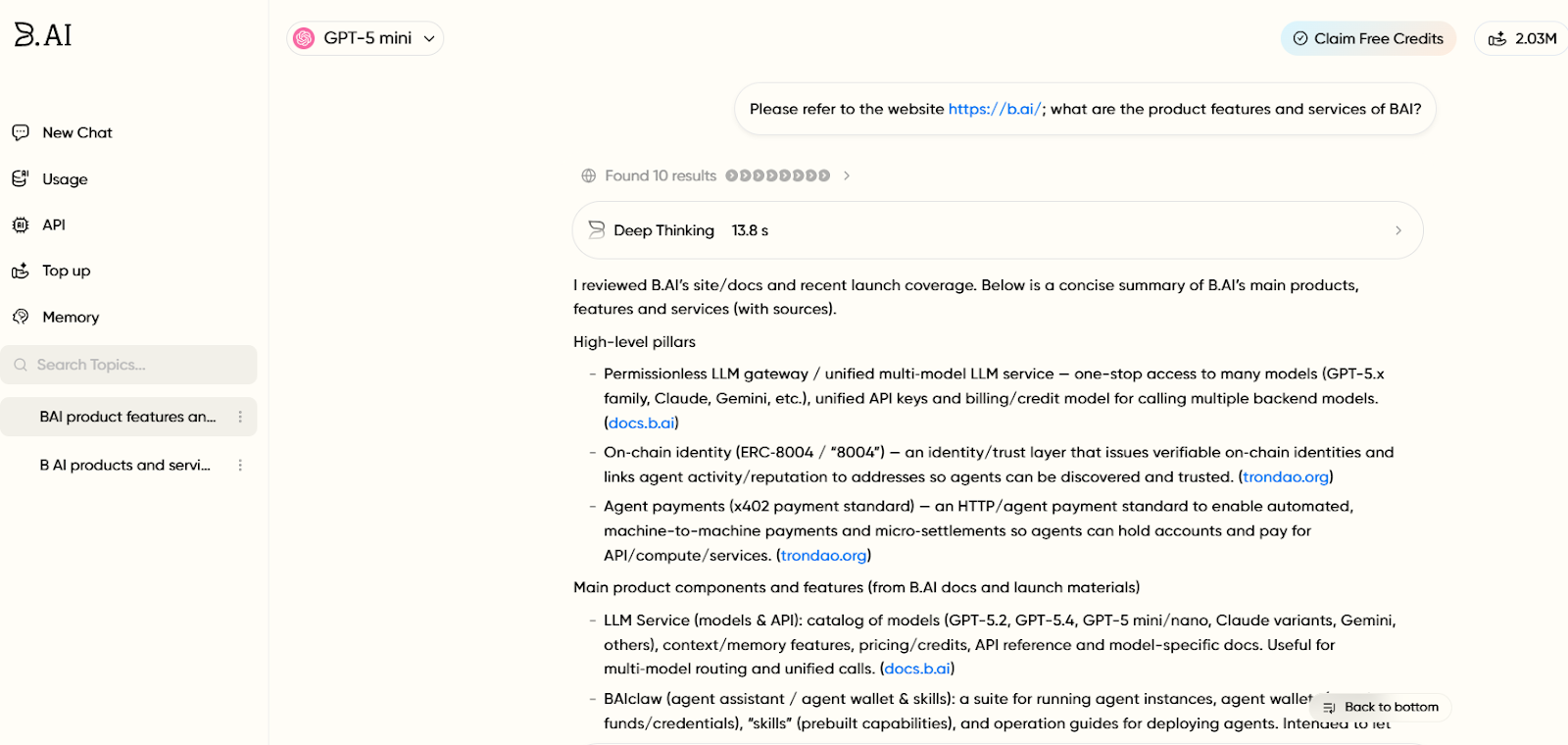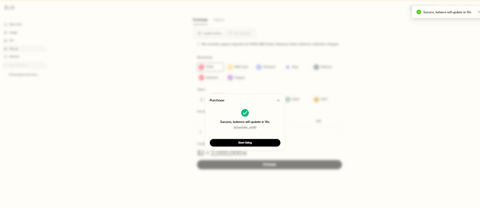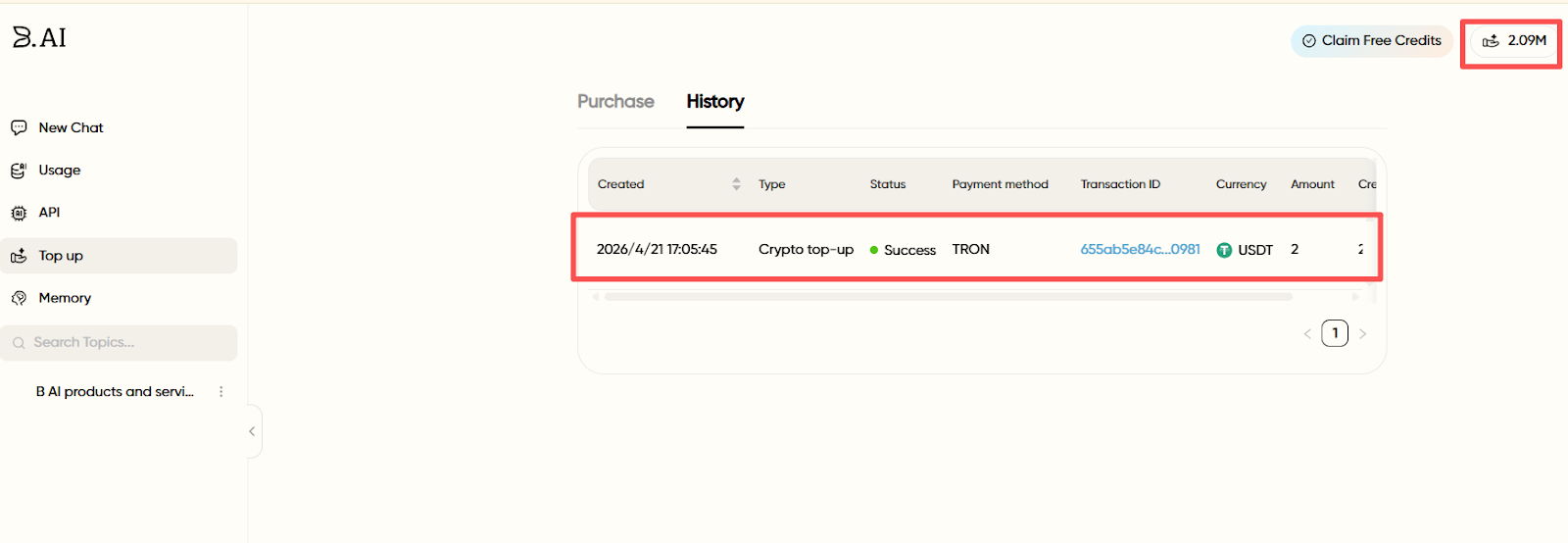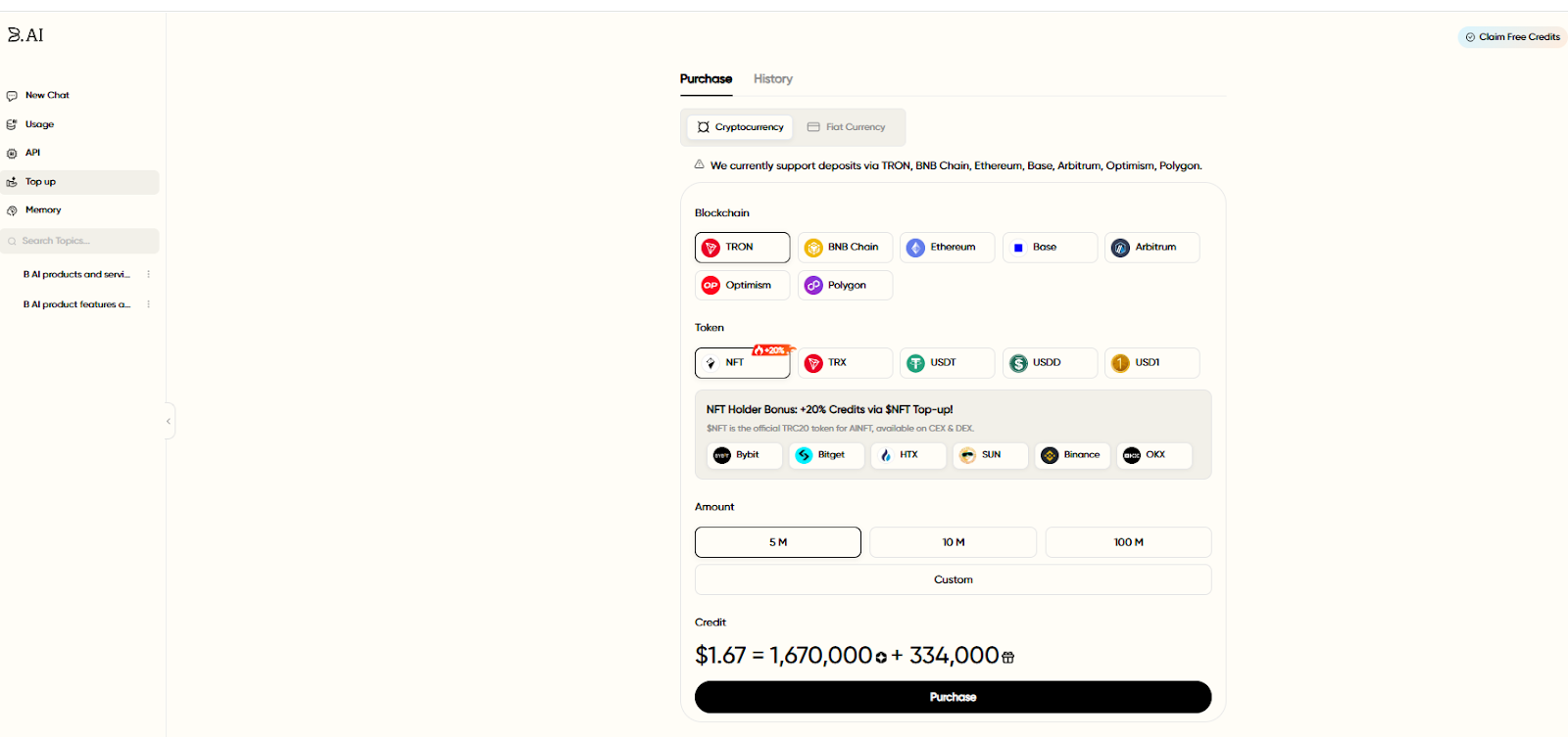 1. Cryptocurrency Top-Up: B.AI LLM Service currently supports networks like TRON, BNB Chain, Ethereum, Base, Arbitrum, Optimism, and Polygon. Supported assets for top-up include NFT, TRX, USDT, USDD, and USD1. After a successful top-up, records can be viewed in the top-up history, and account credits will automatically increase. Notably, users who top up using NFTs will receive an additional 20% credit bonus.